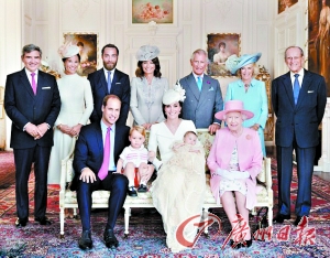 当地时间7月9日,英国王室公布了夏洛特小公主接受洗礼当天拍摄的照片,其中包括英女王夫妇、查尔斯王储夫妇、威廉王子夫妇、乔治小王子、夏洛特小公主以及凯特家人一起合照的全家福。