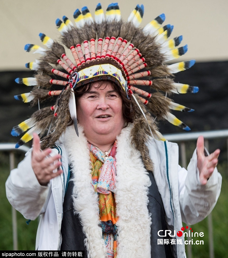 苏珊大妈戴美洲原住民头饰鹰羽冠现身音乐节助阵