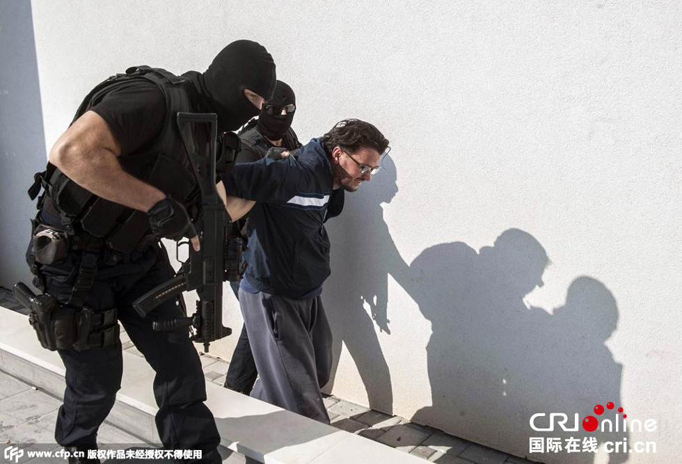 当地时间2015年6月12日,科索沃普里什蒂纳,警察押送逮捕的嫌疑人到法庭。五人因涉嫌策划“恐怖袭击”向首都饮用水供应系统投毒被捕。警察在嫌疑人的车中发现与IS相关的武器、弹药和宣传材料。图片来源:ARMEND NIMANI/CFP