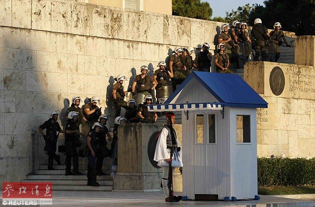 希腊的防暴警察在国会附近戒严。