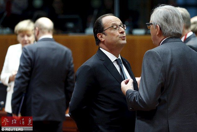 法国总统奥朗德称,新的协议将给予希腊约800亿欧元资金。图为法国总统奥朗德与欧盟委员会主席交谈。