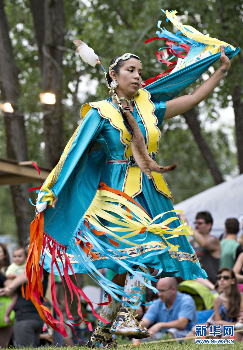 加拿大原住民节7月12日在蒙特利尔拉开帷幕,来自加拿大各地的原住民身着传统服装,将在今后的2个月里进行歌舞比赛, 以此纪念他们的祖先。在这段时间,原住民身穿各种色彩艳丽的民族服装,头戴各种头饰,脖子上挂着多种造型不同色彩的项链,手持羽扇和鹰爪杖,击鼓唱歌。歌者的歌声时高时低,时长时短,感觉一会似渴望奋进,一会是哀鸣呐喊。舞者的舞姿热情奔放,令人眼花瞭乱,目不暇接。原住民节已成为加拿大多元文化中的亮丽的风景线。(摄影 安德鲁·宋)。