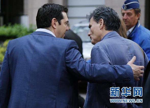 7月13日,在比利时首都布鲁塞尔,希腊总理齐普拉斯(左)与希腊财政部长察卡洛托斯在欧元区领导人峰会结束后准备离开会场。欧洲理事会主席图斯克当日上午表示,经过了17个小时的谈判,欧元区领导人峰会终于就希腊债务问题达成协议。希腊及数个国家议会需在14日或15日前通过刚刚达成的这项协议,以便重启相关谈判。 新华社记者 周磊 摄