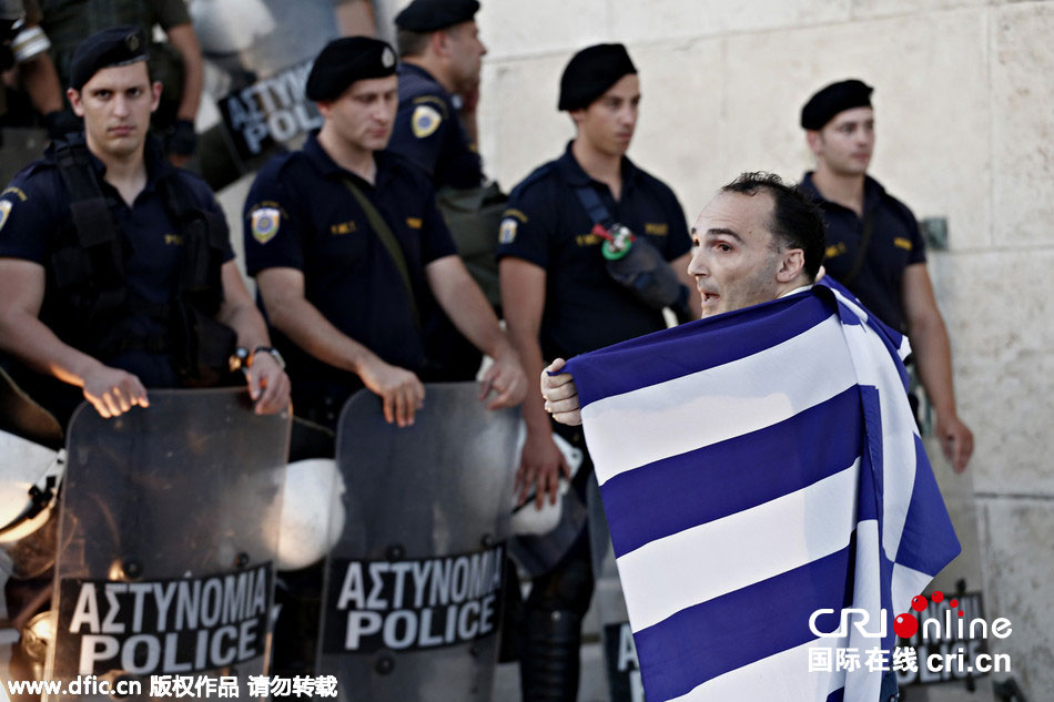 当地时间2015年7月13日,希腊雅典,民众举行反欧盟示威活动,抗议债务协议终达成和紧缩政策。据悉,欧洲理事会主席图斯克当天在布鲁塞尔宣布,欧元区领导人与希腊就新一轮援助协议达成一致,希腊此次将避免脱离欧元区。图片来源:东方IC