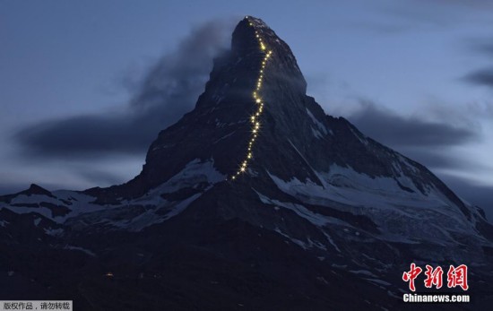 当地时间2015年7月13日,瑞士策马特,灯光照亮第一批征服马特洪峰的登山者所走的路径,纪念Edward Whymper和队员首次攀登马特洪峰150周年。