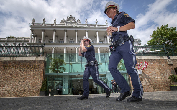 (图为维也纳警察在伊朗核问题谈判现场巡逻。)