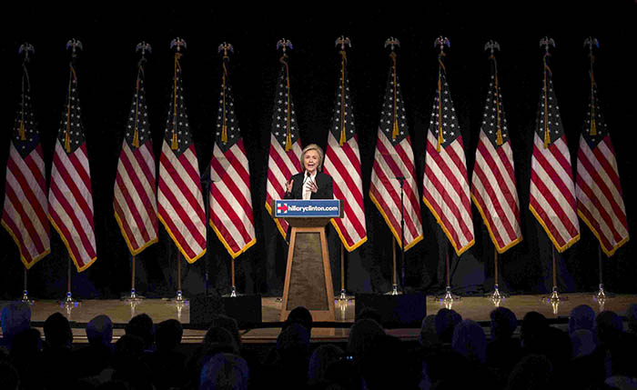 7月13日,美国民主党总统候选人希拉里·克林顿在纽约曼哈顿岛的新学院大学发表演讲。