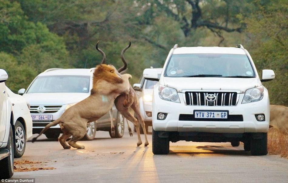 2015年7月10日,在南非克鲁格国家公园,英国业余摄影师Carolyn Dunford抓拍了惊险的一幕,狮子们和羚羊在公园游客车间进行厮杀,狮子欲将对方变成晚餐,羚羊奋力抵抗但最终不敌。整个血腥的过程发生在距离游客一米之地。车上的乘客在过程中战战兢兢,只有摄影师鼓起勇气拍照。
