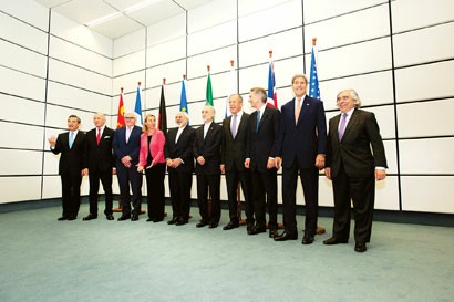 14日,在奥地利首都维也纳联合国中心,伊核问题六国、欧盟代表和伊朗外长合影。 新华社发