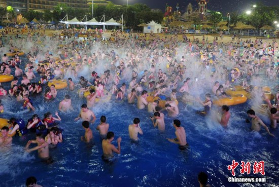 7月14日,入伏后武汉市气温再次攀高。由于酷热难耐,武汉玛雅水乐园迎来近万名游客,创入夏以来高峰。市民在水中尽享清凉,场面宛如“下饺子”。 中新社发 张畅 摄