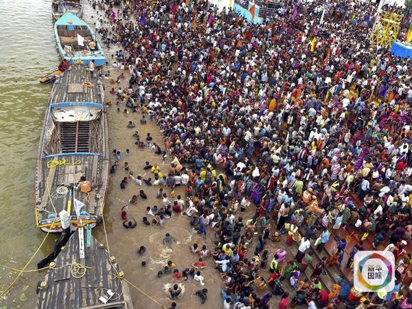 参加“圣浴”活动的民众拥挤在戈达瓦里河岸边。(图片来源:新华/路透)
