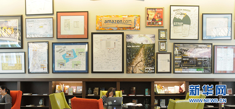 亚马逊总部的大楼设有大大小小的公共区域,供员工小憩、晤谈、阅读、工作之用。图为一个类似家庭客厅的公共区域的墙饰。墙上挂着一些亚马逊以往上线项目的海报,上面有项目小组成员的签名。(新华社记者马丹 摄)