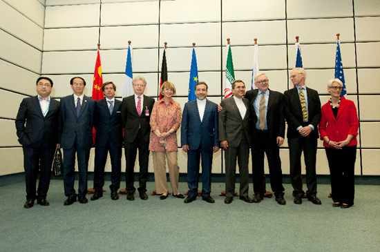 (7月14日,在奥地利首都维也纳联合国中心,各方代表合影。)