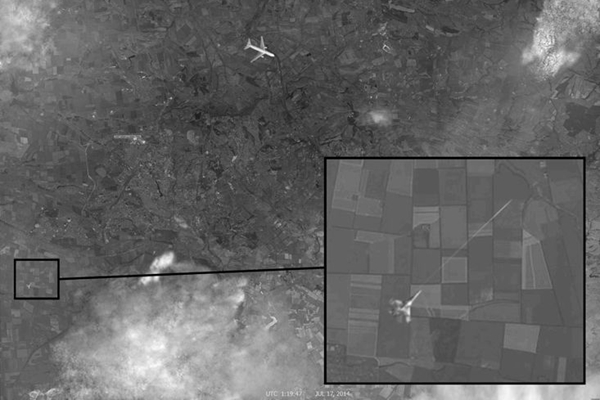 俄罗斯官方媒体“第一频道”2014年11月公布了一张MH17航班坠机前的卫星图片,疑似一架战机向航班发射空对空导弹。但西方媒体认为该卫星图系伪造。(图片来自网络)