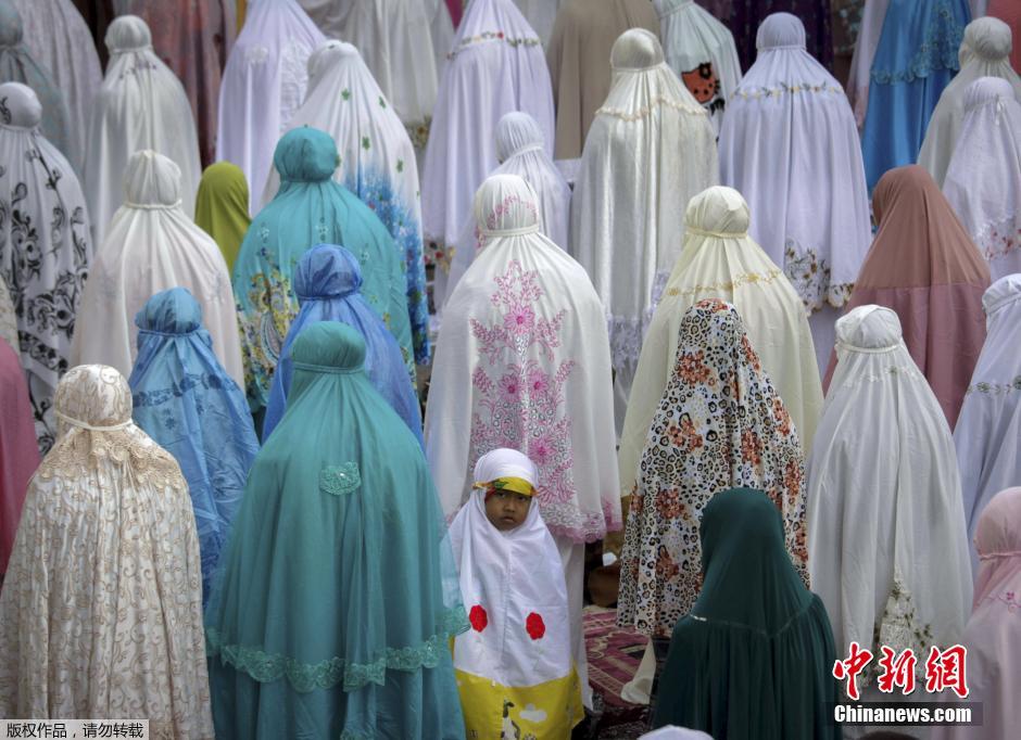 开斋节是穆斯林庆祝斋月结束的重要节日。斋月开始和结束是以新月的出现为标志,全球穆斯林根据当地新月出现的时间先后进入斋月,因此斋月的起讫日期每年都不一致,开斋节的日期也略有差别。图为当地时间2015年7月17日,印尼望加锡,穆斯林妇女带着孩子参加开斋节祈祷。