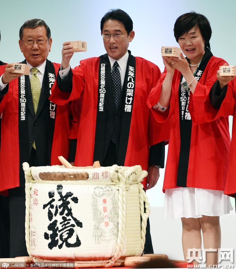 当地时间2015年7月19日,日本东京,韩国驻日本大使柳兴洙,日本外相岸田文雄,以及日本第一夫人安倍昭惠出席日本和韩国复交50周年纪念活动。