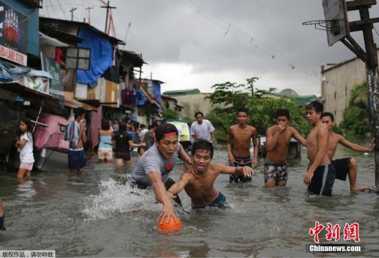资料图:当地时间2015年7月8日,菲律宾马拉翁,菲律宾孩子们在洪水中打球。台风“灿鸿”经过菲律宾东北部海域后,将登陆台湾。随之而来的大雨,袭击了菲律宾首都马尼拉和其他北部省份。