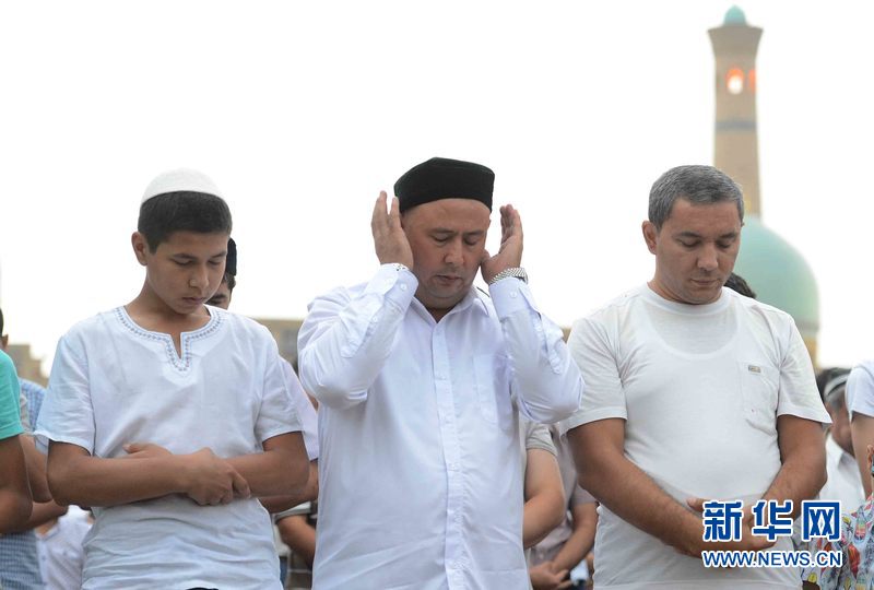 7月18日,乌兹别克斯坦首都塔什干哈斯特·伊玛姆建筑群清真寺广场,人们在参加开斋节礼拜。当天,乌兹别克斯坦各地庆祝伊斯兰教传统节日--开斋节。(新华网记者 沙达提 摄)