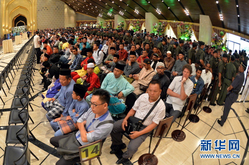 文莱民众在努洛伊曼王宫大厅等待与苏丹握手。(新华网发 杰弗里·黄 摄)