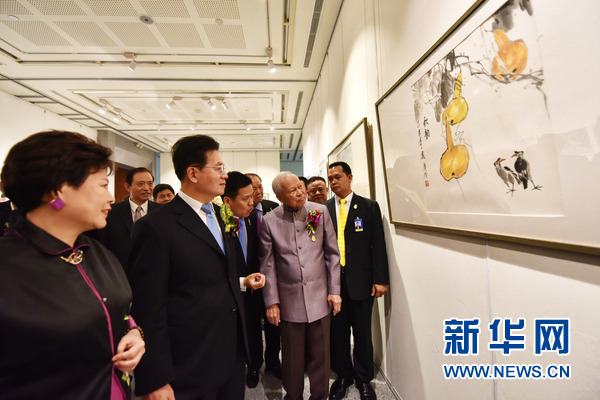 7月18日,在泰国曼谷中国文化中心,泰国枢密院主席炳·廷素拉暖上将(前排右二)在纪念中泰建交40周年庆祝活动中参观外交官书法绘画摄影展。 新华网记者 李芒茫 摄