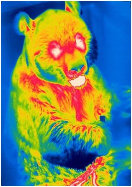 要说大熊猫的懒,还真是内外如一,从表皮一直深入到了基因里。上面这张图片看起来有点可怕,其实不过是用热成像技术给大熊猫拍的照片。可以看出来,大熊猫体表许多地方的温度都较低,测量显示,大熊猫的体表温度与同样黑白相间的其它动物如斑马和斑点狗等相比要低得多。