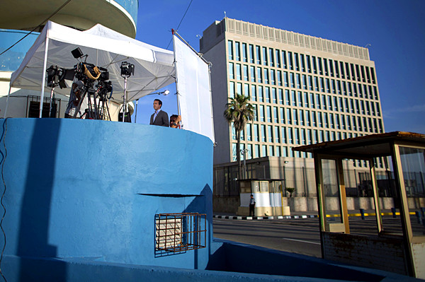 7月19日,一家美国电视台主播在美国驻古巴利益代表处出镜。(新华社/路透)