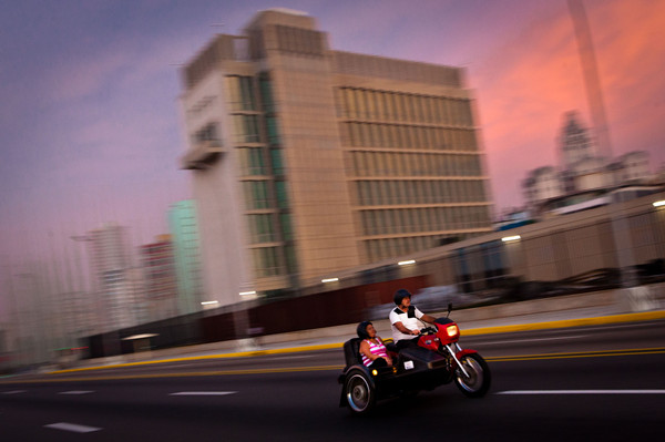 7月19日,在古巴首都哈瓦那,当地人骑着摩托车从美国驻古巴利益代表处旁驶过。(新华社记者刘彬摄)
