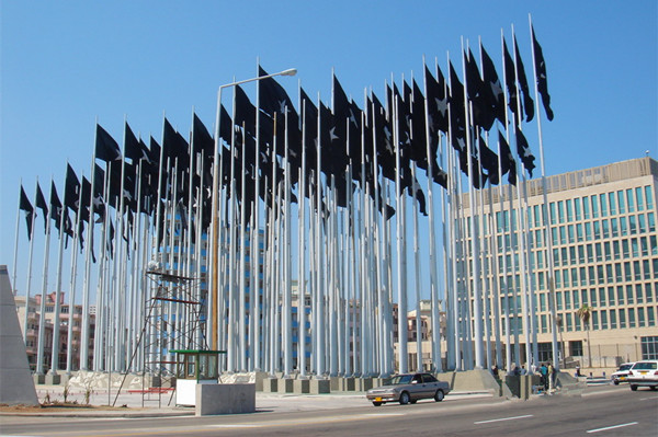 2006年,小布什政府决定在代表处建筑外墙通过电子显示屏放送各种反古信息,古巴政府一怒之下在代表处前竖起了百余根高大的旗杆,升起一面面黑色的旗帜,将代表处遮了个严实。古美关系有所缓和后,广场上黑旗悄然降下。如今,每逢新年和古巴的其他重要节庆,旗杆上飘满了古巴国旗。