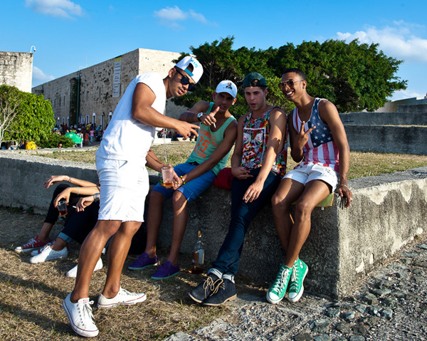 2015年2月17日,身着美国国旗图案的古巴年轻人合影留念。(新华社记者刘彬摄)