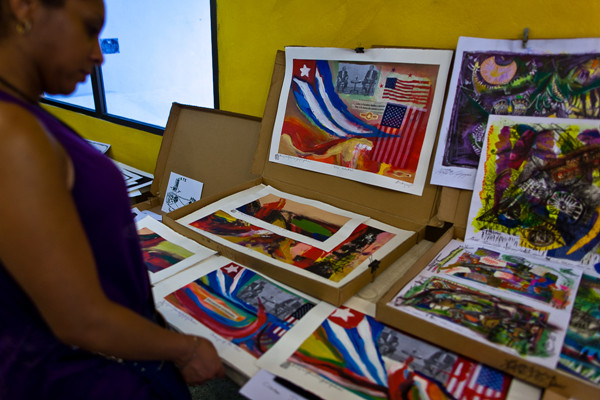 2015年6月18日,游客在挑选古巴与美国关系为主题的版画作品。(新华社记者刘彬摄)