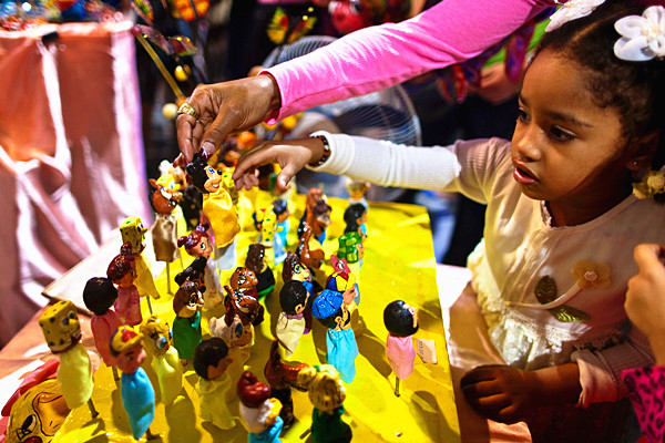 2014年12月13日,小朋友在哈瓦那的一个工艺品展销会上挑选手工制作的米老鼠玩偶。(新华社记者刘彬摄)