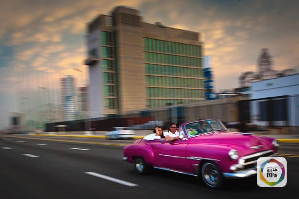 7月19日傍晚,在古巴首都哈瓦那,一辆满载游客的老爷车从美国驻古巴利益代表处旁驶过。(新华社记者刘彬摄)