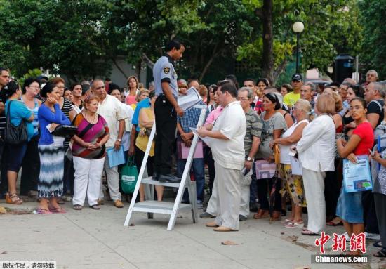当地时间2015年7月1日,古巴哈瓦那,古巴民众在美国驻古巴利益代表处外排队等待办理签证。随着两国领导人宣布美国古巴正式重新建立外交关系,两国民众也会有更密切和频繁的交流。