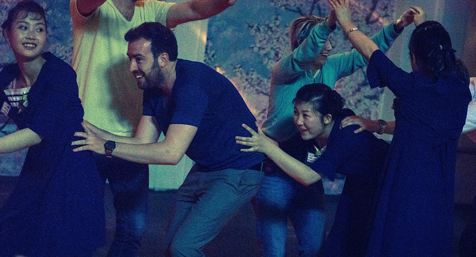 游客和当地居民在朝鲜酒吧中做游戏。(网页截图)