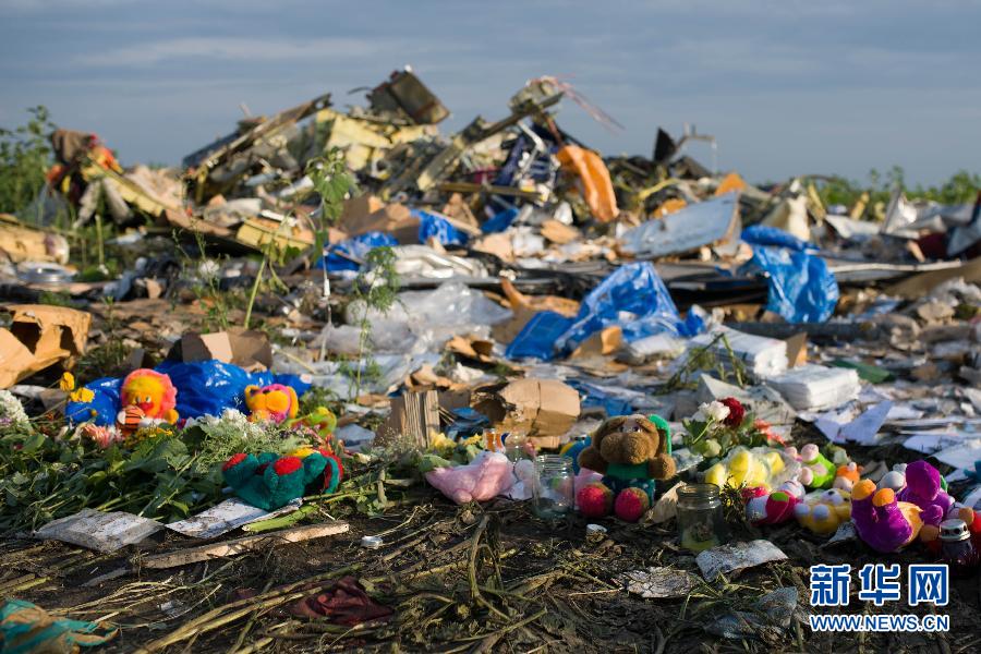 7月19日,在乌克兰顿涅茨克州拉瑟普诺耶村附近,人们将玩具摆放在马航MH17航班坠机现场。当日,马航MH17航班的第一批遇难乘客遗体已经运出空难现场,这批遗体的数量大约为38具。 新华社记者戴天放摄