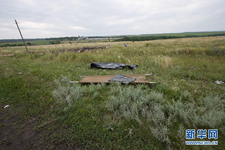 这是7月19日在乌克兰顿涅茨克州马航MH17航班坠毁现场拍摄的搬运遗体用的担架。当日,马航MH17航班的第一批遇难乘客遗体已经运出空难现场,这批遗体的数量大约为38具。 新华社记者戴天放摄
