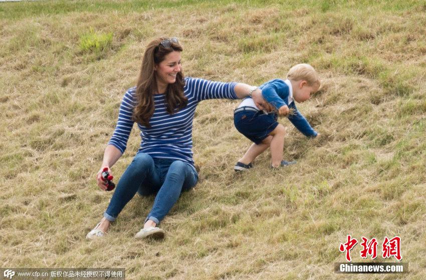 当地时间2015年6月14日,英国泰特伯里,英国小王子乔治和妈妈凯特王妃一起观看慈善马球比赛,为赛场上的爸爸威廉和叔叔哈里加油,小王子欢脱的在草坪上打滚玩耍。图片来源:CFP视觉中国