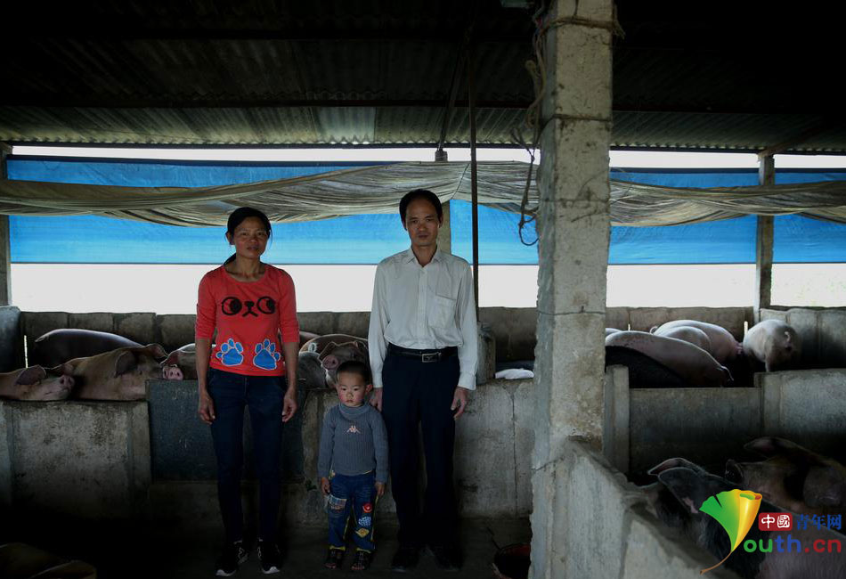 2015年03月29日,福建省漳州市长泰县岩溪镇,36岁的越南新娘赵氏芳(左)和儿子刘南泰、丈夫刘建金在猪圈的合影。
