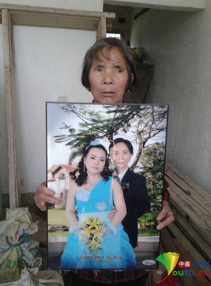 2014年4月30日,江西省星子县苏家塘乡与横塘镇两个乡镇7名越南新娘在一天之内全部跑得无影无踪。两个乡镇7名男子各自花了数万元钱之后,在兴奋中仅仅做了10天新郎,瞬间又变成了“光棍”。图为受害者母亲茫然展示儿子与越南女子的结婚照片。