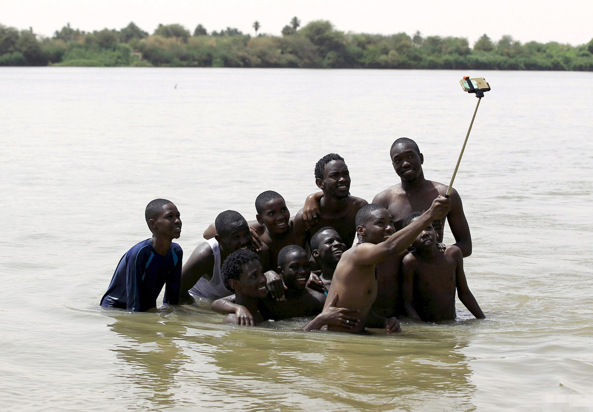 当地时间2015年5月22日,苏丹首都喀土穆城外,一群年轻人正站在尼罗河第一瀑布附近的浅水区里用自拍杆自拍。
