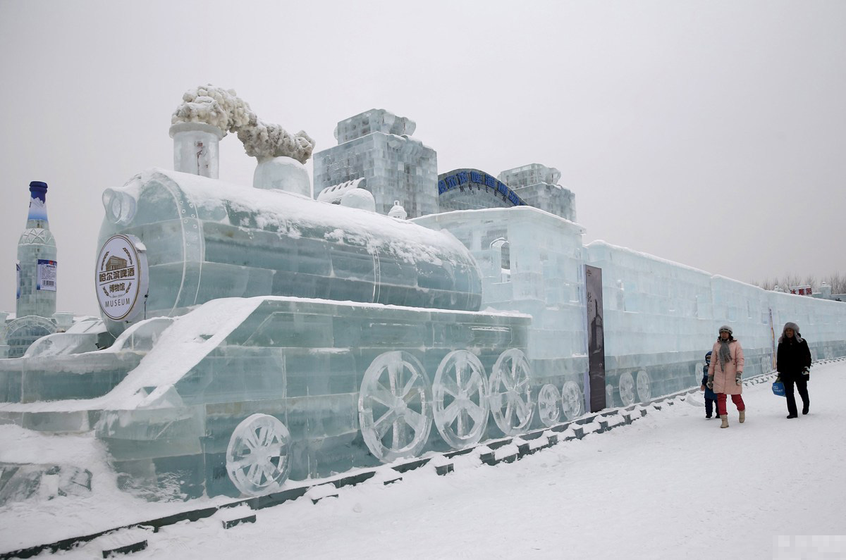 2015年1月4日,黑龙江哈尔滨第31届国际冰雪节上,游客们正走过一尊火车造型的冰雕作品。