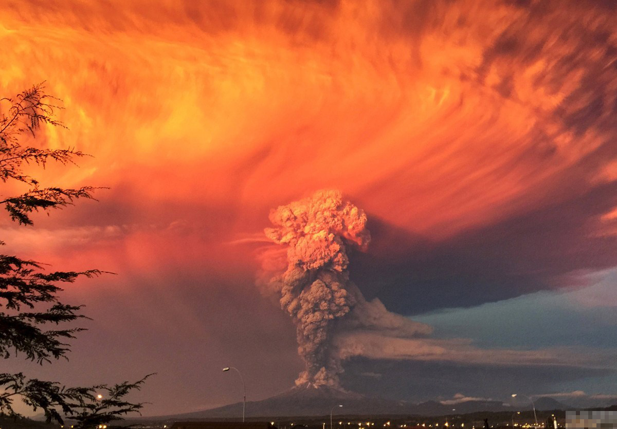 当地时间2015年4月22日,智利蒙特港城,从蒙特港城望去,火山灰和烟雾正从卡尔布克火山喷发出来。