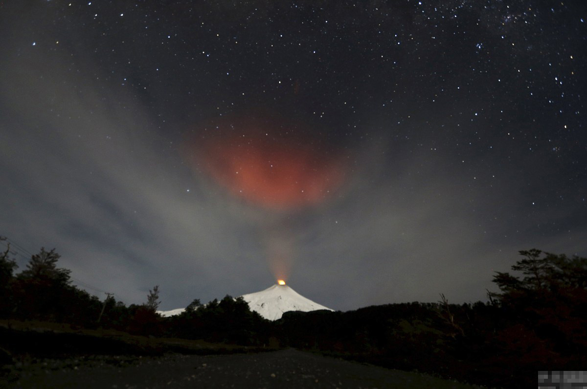 当地时间2015年6月23日,从智利南部普孔附近的村镇望去,烟雾正从比亚里卡火山喷发出来。