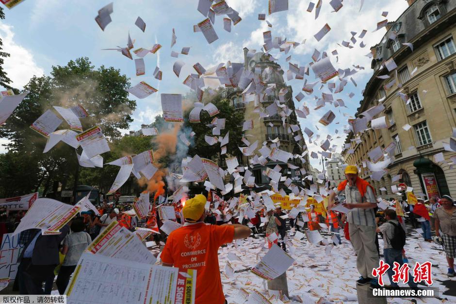 当地时间2015年7月22日,法国巴黎,烟草商组织示威者集会抗议政府推行统一的烟盒包装。政府认为此举可以降低香烟包装对消费者尤其是年轻人的吸引力。但是烟草商认为此举可以令制造假烟的行为更加容易。