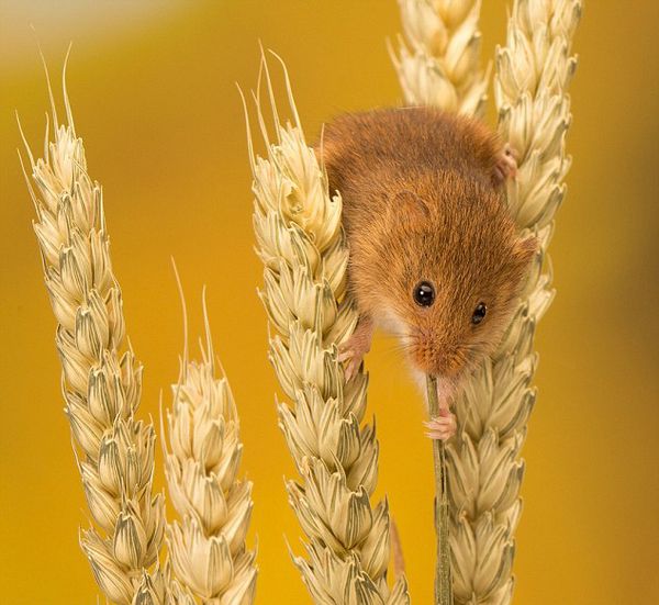 勇敢无畏的小巢鼠平稳地站在两根麦穗间,颇有体操运动员的风范,十分滑稽有趣。
