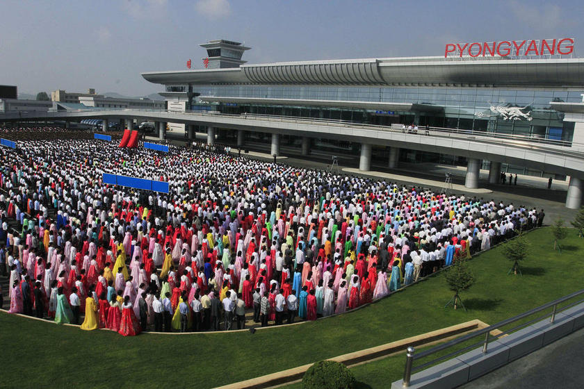 据韩国《中央日报》网站21日报道,2015年6月底,朝鲜最高领导人金正恩偕夫人李雪主和妹妹金与正视察新完工的平壤顺安国际机场,称赞机场内部建设优良。