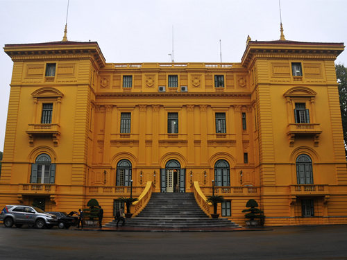 越南主席府是典型的对称式建筑,楼体4层,坐西朝东,呈“工”字型,整体漆成的明黄色和窗户的绿色具有明显的越南特色。而欧式立柱和雕花、百叶窗又显示出上世纪法国建筑的风格。