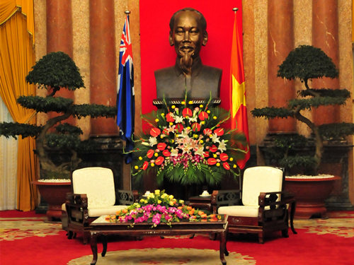 当初的受降地,现已成为越南国家主席府大厅。大厅当中摆放着胡志明半身像,慈祥、庄重。漫步在大厅里,厚厚的地毯下不时传来“嘎吱嘎吱”声,似乎在诉说着越南人民的历史沧桑。