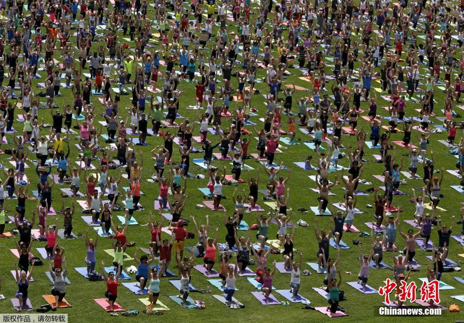 7月22日,加拿大渥太华,大批民众来到国会山前的草坪上,免费学习瑜伽课程,场面极为壮观。