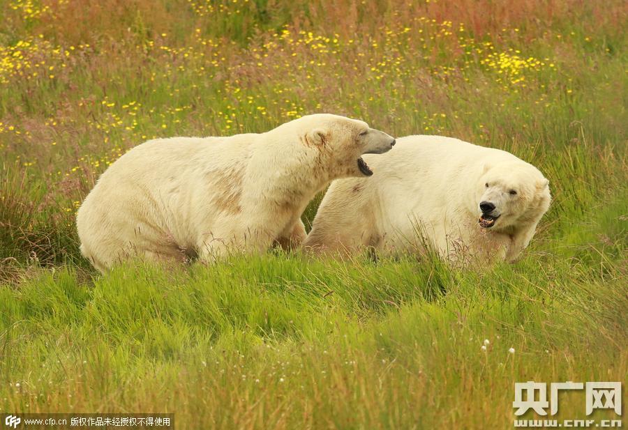 2015年7月23日消息(具体拍摄时间不详),英国苏格兰高地Kingussie野生动物公园,两只北极熊互相打闹,两只后腿站立在草地上拥抱、摔跤,它们咆哮着看似在打架 ,实际是在调整对方在野外生存必须需要的战斗和狩猎技巧。